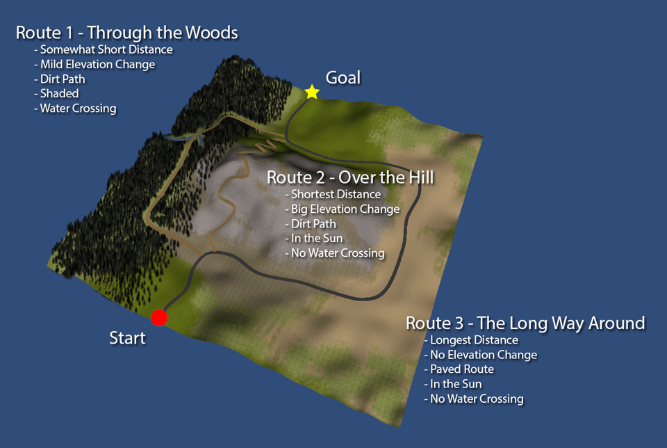 In the interactive example below, the three routes are displayed on a grid where each grid cell is assigned properties from the environment. You can toggle the individual feature layers using the radio selections. Below the grid are a set of sliders representing the agent's preferences for each of the feature types. The OWA weights used for aggregation are at the bottom.